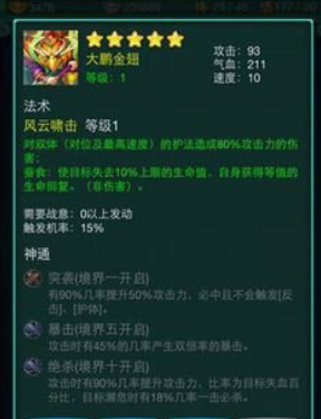 从神通配置来看,大鹏金翅具备突袭、暴击和绝杀三大攻击型被动技能。突袭能在战斗开始时概率提升50%攻击力且攻击必中,有效规避反击和护体效果;暴击可触发双倍伤害,配合高基础攻击能产生可观输出;绝杀则根据目标失血比例提升自身攻击力,当敌方血量低于18%时还有概率直接完成斩杀。这种技能设计使其成为典型的高风险高回报型输出手,需要合理搭配保护型护法才能充分发挥战力。