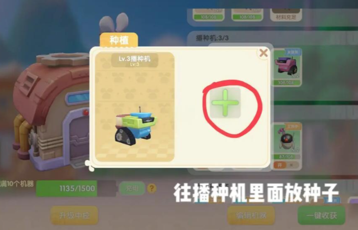 做好播种机后,记得先到中控台添加种子哦!中控台就在饲养奶牛的小屋旁边,靠近后会看到右下角出现手套图标,点开就能选择想种的种子和数量。可以一次性放够多种子,这样后面就不用反复操作啦。放好种子后回到菜地,在界面下方找到机器选项,选中播种机就能往空地上放置了,它会自动帮你把整片地都种满,比手动一个个点快多啦!