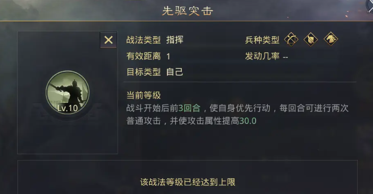 加点定下了攻击的基调,战法的选择和搭配就围绕着怎么把攻击力发挥到极致来展开。马超自带的神技血溅黄砂能提升自身120%的攻击伤害,但代价是不能发动主动战法,这就决定了他的技能栏必须留给被动和追击类战法。最经典也是效果最好的组合是先驱突击加上疾击其后。先驱突击能让他在战斗开始的前两回合获得连击效果,多砍一刀;疾击其后是一个强力的追击战法,能在普攻后追加伤害,两者配合可以最大化利用好他普攻增伤的特性。如果没有这些高阶战法,用温酒斩将或者怯心夺志来过渡也行,怯心夺志还能封住敌人的主动技能,打一些特定队伍有奇效。总之避开所有主动技能,专注强化他的普通攻击体系就对了。