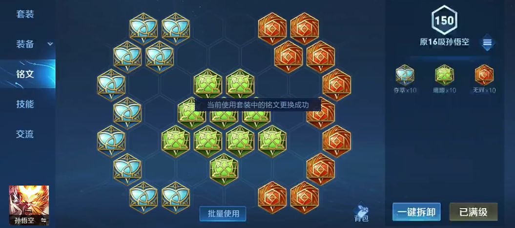 铭文配置对猴子至关重要,红色首选10个无双提供暴击率和暴击效果加成,绿色10个鹰眼增加物理穿透,蓝色10个夺萃提供物理吸血效果。这套组合能确保猴子前期续航充足,减少回城次数,同时暴击效果提升到186%配合装备实现高额爆发。部分情况下蓝色铭文可以混合狩猎和夺萃,以平衡移速和吸血需求。