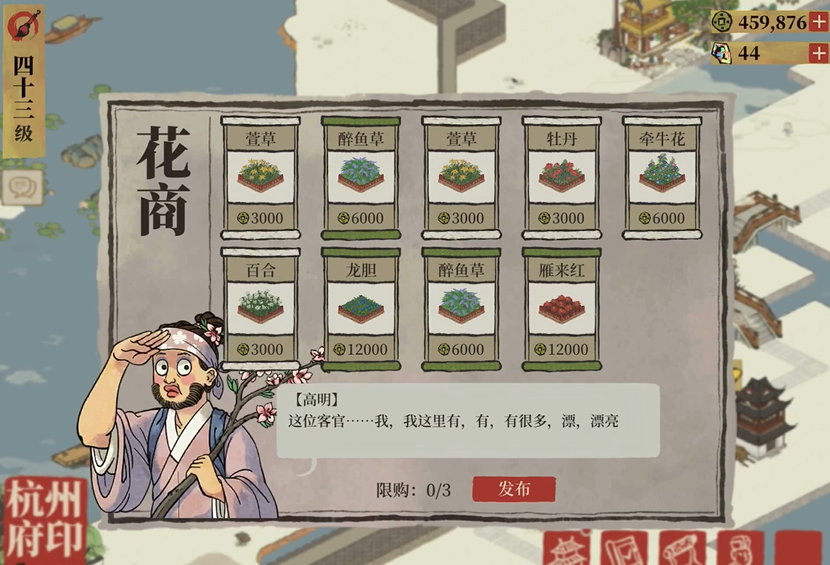 关于花商的刷新机制,他们并非每日都必定出现。他们的来访存在一个随机的刷新周期,有时可能隔几天才来一次,有时甚至一周左右才露面。一旦花商来到你的城市,他就会一直待到次日的0点才会离开,因此你有一天的时间可以与他交易。如果当天没有找到也不必着急,第二天可以继续尝试。有时候兄弟俩会轮流出现,分别售卖不同品质的花坛。找到花商后,点击他即可打开交易界面。哥哥高明主要出售普通花坛,而弟弟高觉则提供更为稀有的花坛品种。