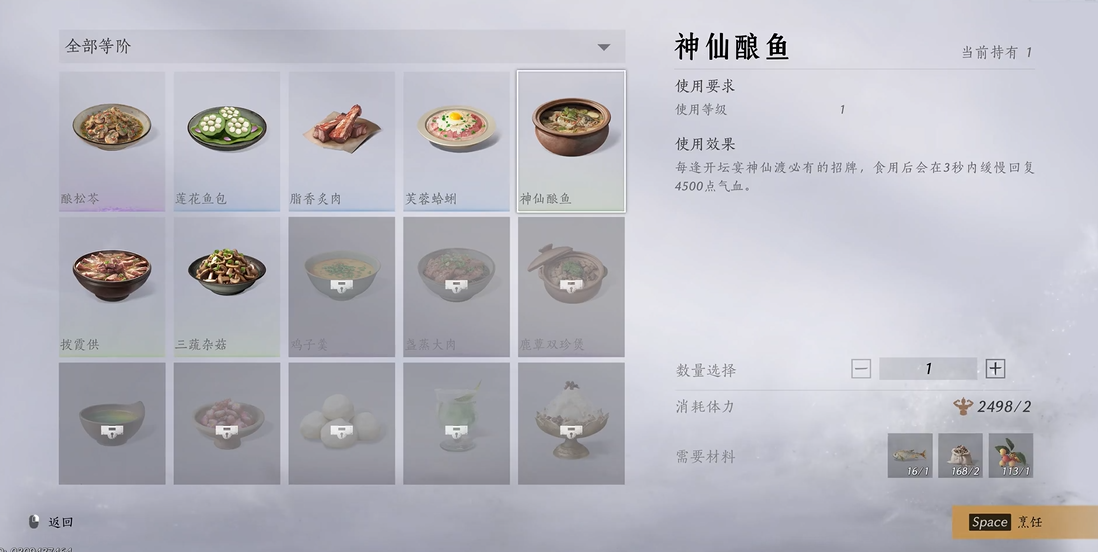 实际制作流程需消耗角色体力值2500点,属于中阶消耗类菜品。在烹饪界面选择神仙酿鱼配方后,系统会自动识别背包内符合要求的材料,确认放入即可开始制作。成功烹饪出的神仙酿鱼为消耗品,其核心效果是在3秒内持续回复角色4500点气血值,适合战斗间隙或探索中紧急恢复使用,但需注意食用后的冷却时间。