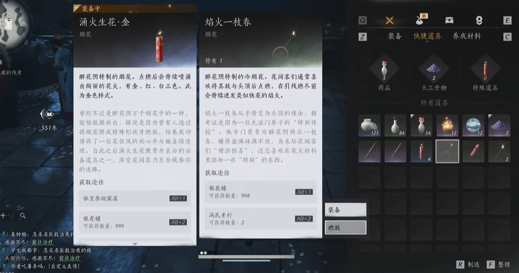 打开装备栏界面,在工具栏区域找到烟花物品,它通常与鱼竿共享同一个槽位。选择名为一枝春的焰火进行施放,在燃放过程中,烟花会随机呈现出绿色视觉效果。这时系统会提示你完成了头顶一抹绿的发现,标志着挑战的成功触发。