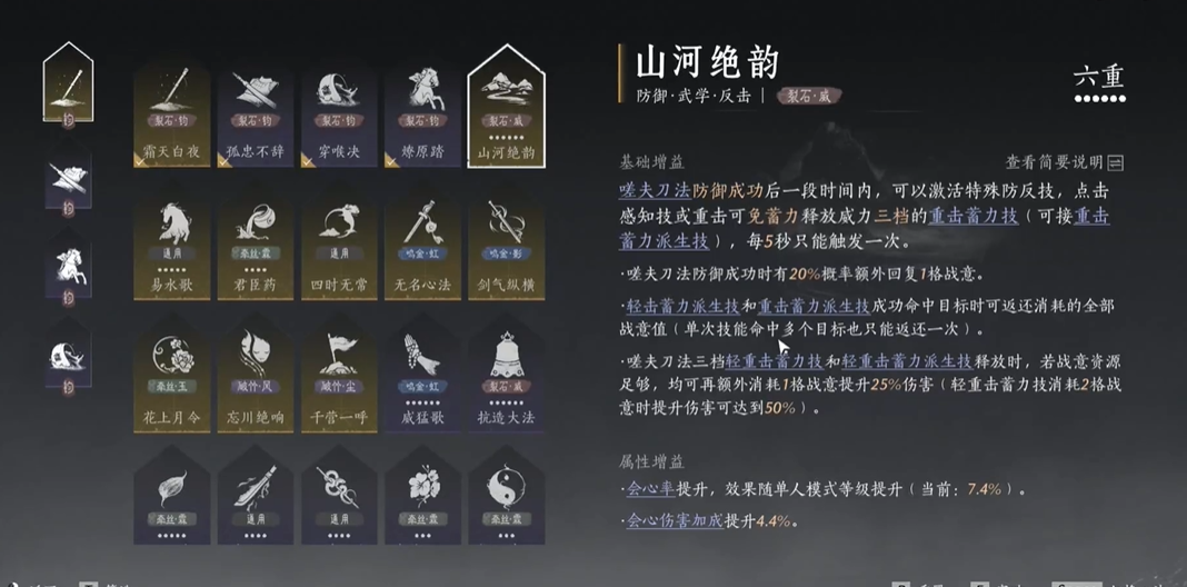 嗟夫刀法的专属心法山河绝韵,能在防御成功后的一段时间内,让你通过点击感知技或重击直接释放免蓄力的重击蓄力技,大幅提升反击的突然性与伤害。以防御见长的裂石威流派,则常搭配山河绝韵、困兽心经、磐石诀等心法,它们能分别提供特殊的防御反击效果、低血量护盾以及嘲讽减伤,共同构筑起坚固的防御反击体系。武器方面,陌刀、八方风雷枪等因其攻防一体的特性,常成为防反打法的热门选择,通过特定连招(如释放枪技后切换陌刀)可以获得可观的伤害加成。