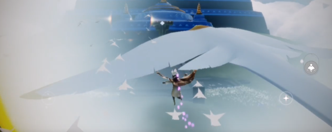 双人协作前往效率更高,需与好友解锁背背动作,一人切换高个子体型发起背背,另一人使用矮人面具保持矮个子状态,两人同时点击对方头顶的背背按键触发螺旋升空效果,升空过程中保持视角向上,朝着神庙右侧云层顶端飞行,抵达云层高处后寻找平缓的云团落脚,重复背背飞天操作逐步提升高度,过程中通过牵手图标维持互动状态,防止升空中断,云层顶端视野开阔,能清晰看到形似冰淇淋的白色山体轮廓,朝着轮廓方向平稳飞行即可靠近山体。