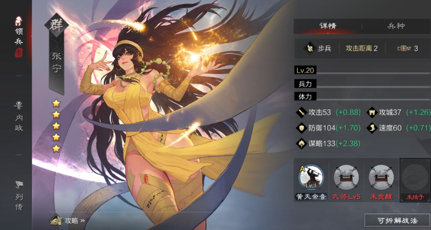 朱儁在阵容中定位中军,兵种选择弩兵,点出地利与齐射,全速度加点确保先手,战法携带反计之策与空城,反计之策可封锁敌方主动战法,空城提升自身生存,利用西乡武功稳定减伤并为队友增伤,速度必须快过司马懿与荀彧,保证增伤效果全程覆盖输出回合。司马懿作为大营核心输出,兵种转死士,全谋略加点,战法携带神兵天降与大赏三军,打造神赏体系为全队增伤,依靠高额谋略属性打出稳定溅射伤害,压制敌方整体血线。荀彧担任前锋,兵种转长弓,战法携带众谋不懈与三术奇谋,驱虎吞狼的全体禁疗完美克制敌方急救与恢复,众谋不懈触发稳定伤害,三术奇谋补充爆发,与朱儁、司马懿形成闭环控制与输出链。