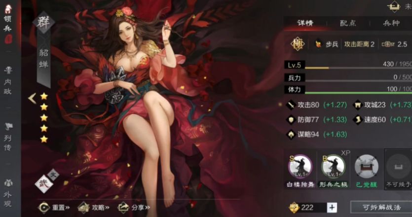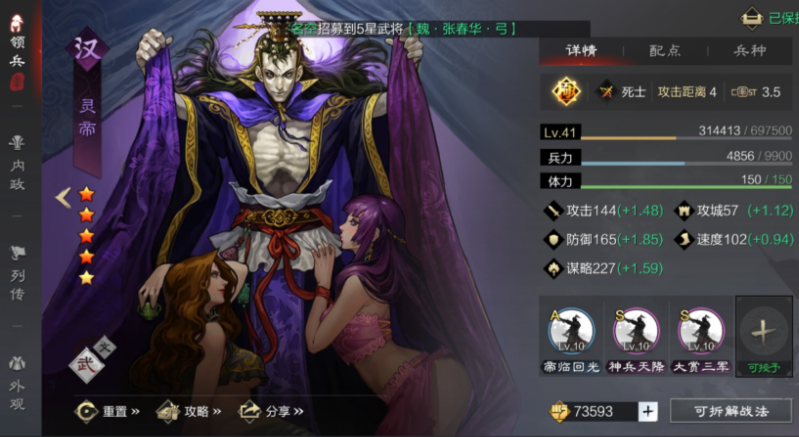 汉弓经典组合中,大营灵帝携带道行险阻、兼弱攻昧,主打持续恐慌与策略伤害,中军貂蝉携带落雷、迷阵,主打控制压制,何太后坐镇前锋,携带避其锋芒与磐阵善守,全谋略加点提升减伤幅度与规避稳定性,这套组合无需高红武将即可成型,前四回合凭借双重减伤大幅压低战损,貂蝉的控制可限制敌军输出节奏,灵帝在后半场持续收割,面对物理菜刀队与主动战法队伍均有稳定发挥,开荒期转型战场也无需更换核心武将,资源消耗低且战功收益高。
