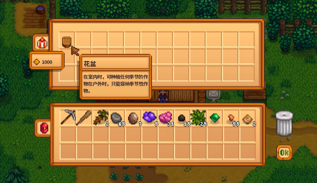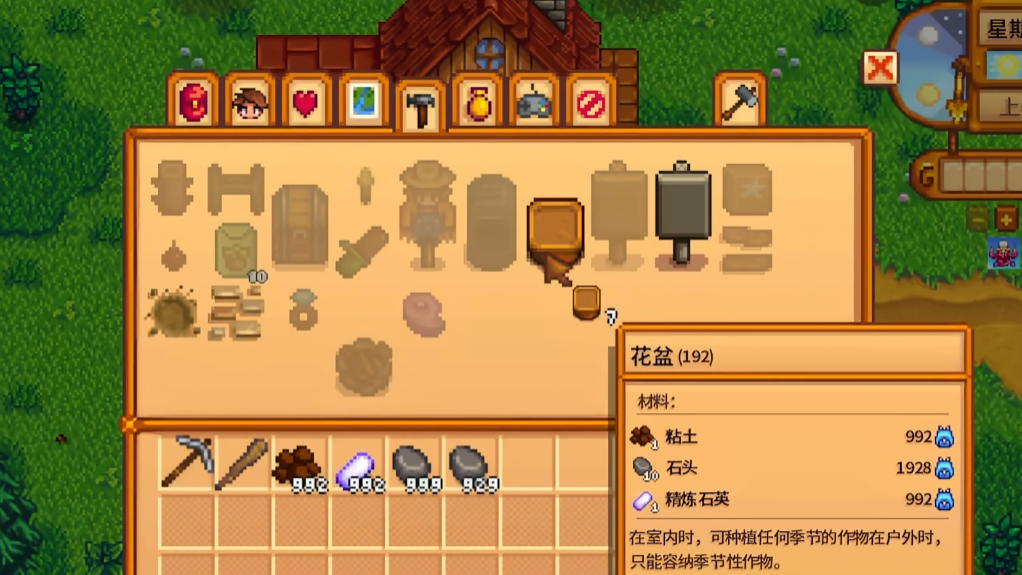 花盆在星露谷物语中是一种室内种植容器,允许玩家在非耕地环境下栽培作物,不受季节限制。它可以通过完成社区中心工艺室的春季作物收集包解锁配方,制作材料为1个黏土、10个石头和5个纤维。花盆的主要功能是扩展种植空间,尤其适合在温室、农场建筑内部或玩家住宅中使用,弥补了传统耕地受季节和天气影响的局限性。