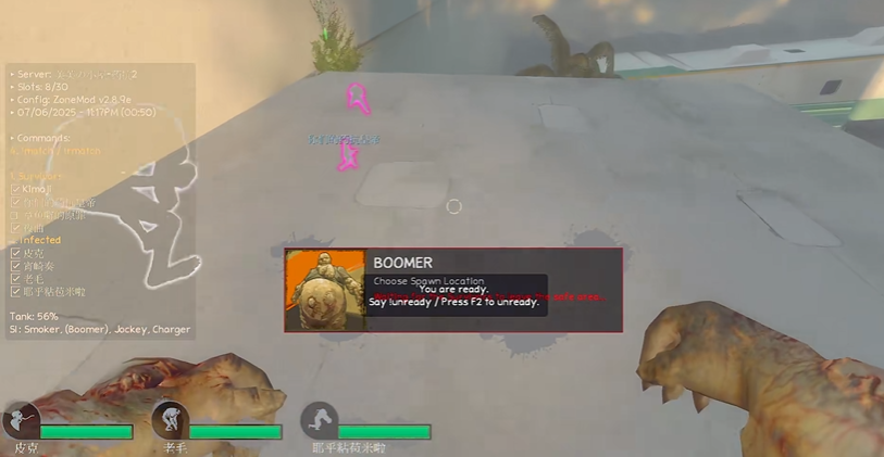 语音沟通明确集火目标,如优先解决医疗包持有者或压制高输出角色。Smoker与Hunter可形成连招,前者拉扯目标后者飞扑压制;Charger撞散阵型后,Boomer及时补上胆汁扩大混乱。若幸存者固守角落,Tank可摧毁掩体或投掷物品逼迫其移动。感染者方需持续施压,消耗对方弹药与治疗资源,最终在关卡后半段实现歼灭。