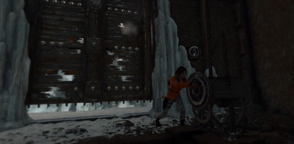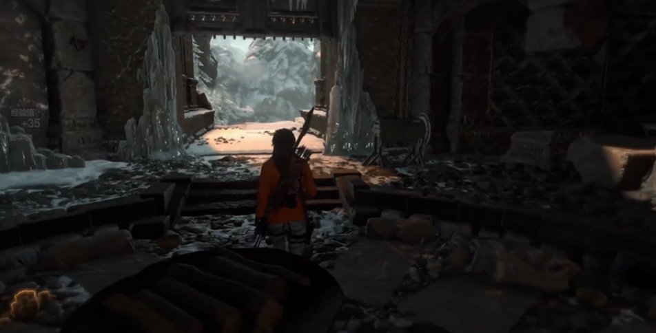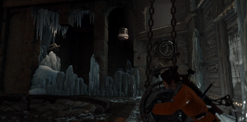 先拉动大厅门口的转盘把大钟降下来,然后跳到钟摆附近的断崖上,这里能看到风吹进来的缺口。用弓箭绑好绳索连接钟摆和上方轮盘,转动轮盘把钟摆拉到最高点。别急着放,耐心观察风的节奏,等强风即将灌入时快速切断绳索,钟摆会以最大幅度摆动击碎冰块。如果时机不对就多试几次,风力变化是有规律的。