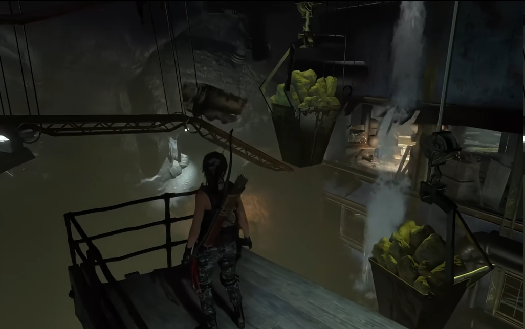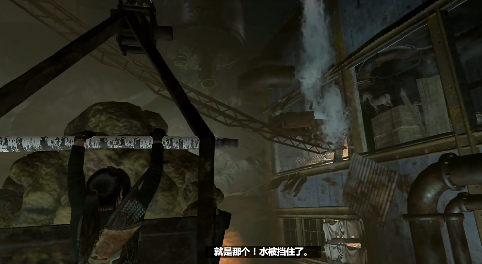 先到平台上用绳索拉出矿车,它会滑到对面被吊斗卡住。这时候跳上吊斗,让吊车坠下来悬在水流下方挡住水。接着瞄准水流下面的白布扔燃烧瓶或射火箭,烧掉障碍就能跳过去了。如果找不到角度,试试从矿车轨道旁的小平台起跳,或者留意左侧隐秘的拉绳,能把矿车推出来再连上绳柱。