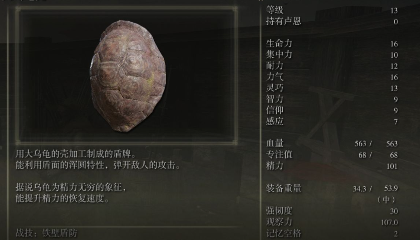 乌龟壳本身是一面百分百物理防御的中型盾,举盾格挡物理攻击时不会掉血,但面对魔法、火焰等属性攻击时仍会受到伤害,需注意躲避。它的重量相对较重,会影响你的翻滚速度,因此搭配较为轻便的武器会更合适。这面盾牌自带缓慢恢复精力的被动效果,举盾行走时能更快回复耐力,对新手维持防御和进攻节奏非常友好。需并非所有攻击都能被盾反,例如大多数跳跃攻击、部分BOSS的特殊技能以及体型巨大的怪物攻击通常无法弹开。如果你未来想尝试其他盾牌但又想保留盾反选项,可以前往啜泣半岛击败那里的黑骑士,它会掉落与乌龟壳相同的战灰供你使用。