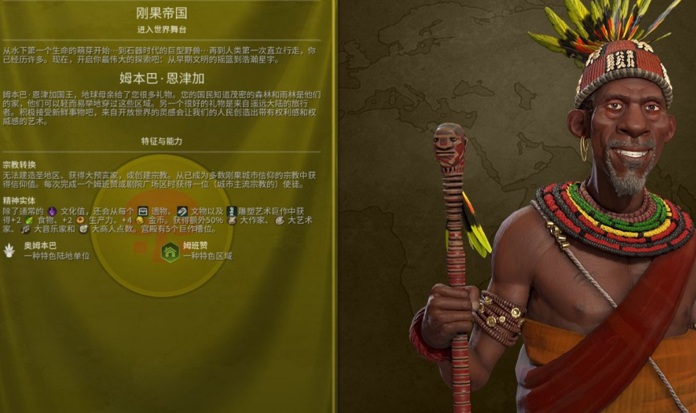 刚果被许多玩家视为种田流的顶级选择,其核心优势在于卓越的人口与经济发展能力。它的特色建筑姆班赞替代了普通的邻里社区,能更早解锁且建造需求减半,最关键的是它能无视地块魅力固定提供大量住房,彻底解决了城市人口增长的核心瓶颈。刚果能从存放的杰作、圣遗物中获得额外的食物、生产力和金币,配合其翻倍的大作家等伟人点数获取,使得它在专注于内部发展的能轻松积累起强大的文化和高额的综合产出,为任何胜利方式打下坚实基础。