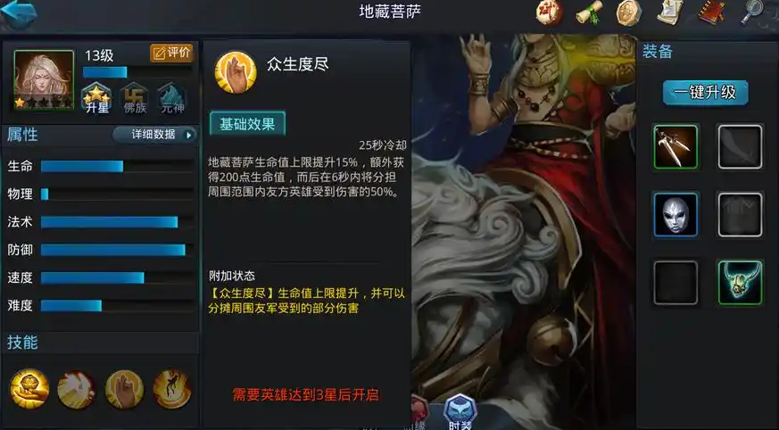 吕布的核心技能叫做战神降临,这个技能简单粗暴,就是挥动方天画戟对敌方一列目标造成巨量的物理伤害。这次攻击本身就会增加大量的额外暴击率和暴击强度,让他很容易打出成吨的暴击伤害,开局就有机会秒掉对面一整排的敌人,这种压迫感在前期推图和竞技场里都