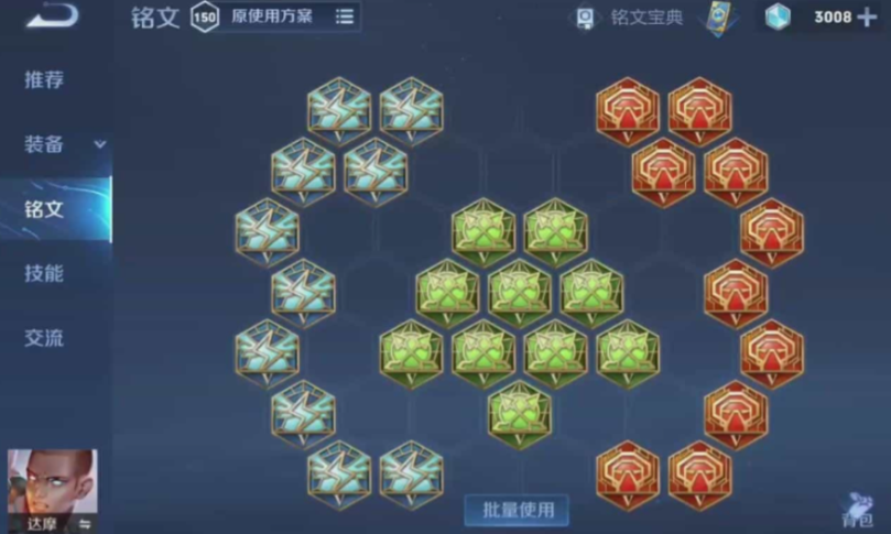 达摩的铭文搭配主要以百穿为核心,也就是红色选择异变,绿色选择鹰眼,蓝色选择隐匿或者狩猎。这套铭文能提供大量的物理攻击、物理穿透、移动速度和攻击速度加成,让达摩在前期对线时就能打出不错的伤害,同时提升机动性,方便他快速支援队友或撤退保命。物理