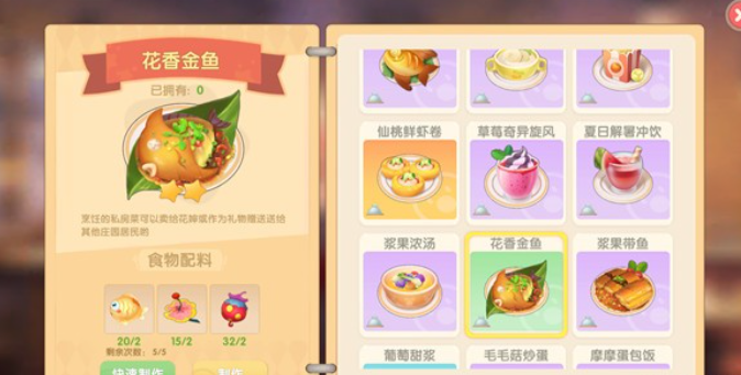 花香金鱼是一道两星稀有度的料理,它在餐厅中出售可以获得稳定的收益,而且制作过程对新手玩家来说比较友好。这道菜的配方需要金鱼、奇异果和毛毛花这三种食材,通常各准备两个就能开始制作。花香金鱼的研究条件并不复杂,只要掌握基本步骤,你就能轻松解锁这